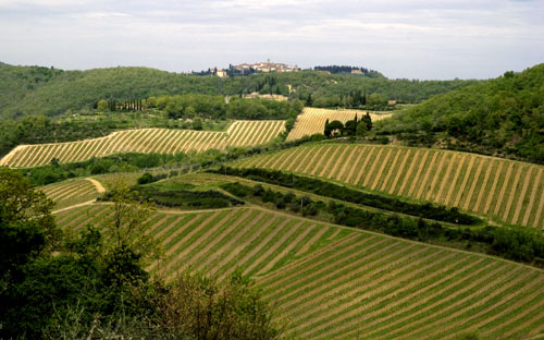 E’ qui tutt’intorno che in pochi chilometri si hanno dei capisaldi del Sangiovese chiantigiano, dal campione assoluto di finezza Castell’invilla, ai nomi di spessore San Felice e Castello di Bossi, con i panorami vitati ed i borghi medievali che spuntano e sporgono in mezzo ad infinite distese boschive inframezzate da vitigni con filari in ordine Francescano. Ma è questo vitigno ondeggiante che ha un non-so-che di bello tutto suo…